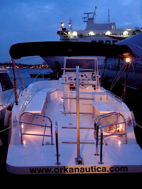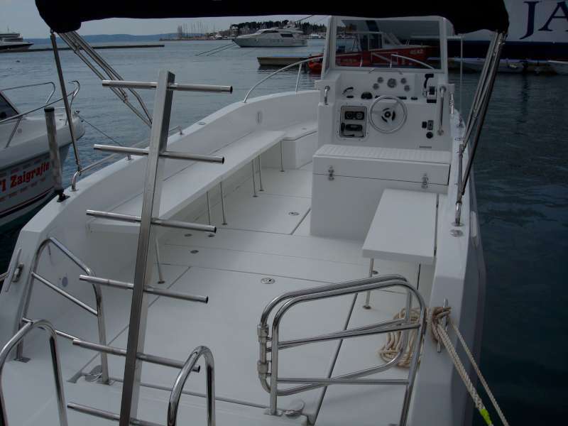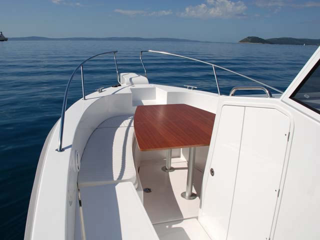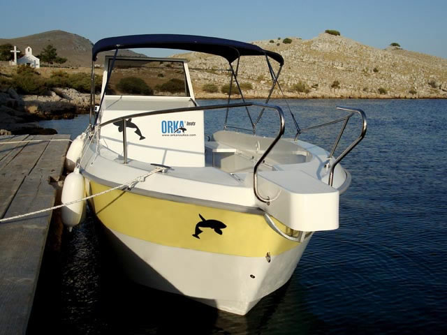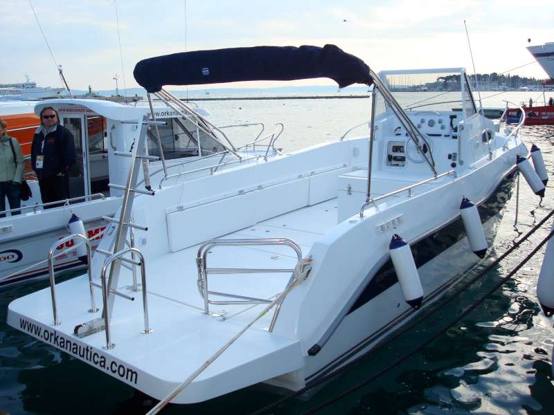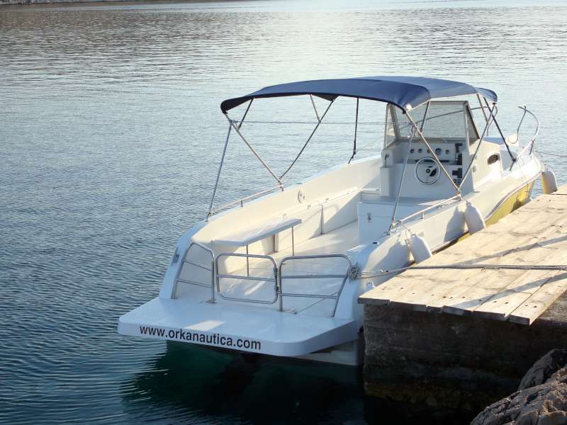 Veliki kokpit je samoprazneći, a cijela površina poda prekrivena je modernom, čvrstom i otpornom protukliznom površinom ovalnog uzorka, koja osim funkcionalnosti i lijepo izgleda. Na brodicu je uvijek lako ući, bilo da izlazite iz vode i penjete se ljestvama za kupanje, bilo da ulazite preko široke i prostrane platforme, širokog pramčanog ulaza ili sa boka. Orka 740 Open u dodatnoj opremi nudi i razne kombinacije bimini tendi od kvalitetnog inoxa te UV postojanog i impregniranog platna. Možete odabrati da li ćete natkriti pramčani dio, krmeni dio, cijelu brodicu sa dvije bimini tende ili postaviti samo hardtop iznad skipera.