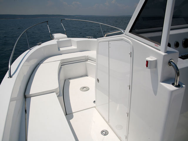 Orka 740 Open has an exceptionally big cockpit with outflows that allow water drain. The entire floor surface is covered with modern, firm and resistant non-skid oval pattern that is both functional and nice looking. The boat is always easily accessible, whether you climb the swimming ladder on the way out of the water or you step aboard over the wide and spacious platform through the wide entrance or from the side. In its additional equipment Orka 740 Open has a great variety of bimini sunshades made of high quality stainless steel and UV resistant and impregnated fabric. One can choose to cover only the bow section, the stern section or the entire boat with two bimini sunshades. A hardtop above the skipper is also an option.